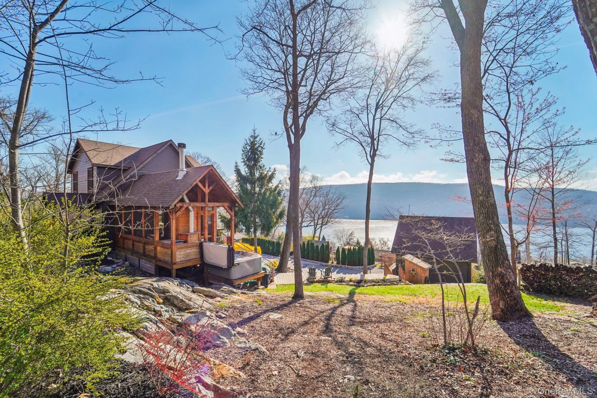 Prepare to be stunned by the magnificent beauty that awaits! This truly is the most beautiful home that I have ever listed. Designed for both relaxation and entertaining, this one-of-a-kind retreat offers a clever layout with panoramic views of Greenwood Lake, Sterling Forest, and the surrounding skyline. Exceptional craftsmanship and meticulous attention to detail are evident throughout, from the 9-foot entryway to the expansive walls of windows. The main floor features an entry way alcove open to a luxurious kitchen, dining and living room space. There is also a spectacular full bathroom alongside a versatile bonus room which can serve as an office, den, or exercise space. On the south side, a glass door leads to a stunning post & beam screened-in porch complete with a vaulted ceiling, stone fireplace, and multiple seating and dining areas. A floating staircase leads to the primary suite, which offers flexible design options including two additional rooms currently used as an office and an oversized dressing area. The showstopper is the elegant primary bathroom, featuring a clawfoot tub, a grand chandelier, a large glass shower, and beautiful vanity in soothing earth tones. This level also includes a convenient laundry space and accessible storage. The playful lower level sets the tone for cozy get togethers with rustic fieldstone walls & lake views. Outside, pathways lead to perennial gardens, a six-person jacuzzi, and a two-car garage with a large recreational room above. Whole house generator included! Residents of Indian Park enjoy two deeded lake access points with a lifeguard, a clubhouse, and Wi-Fi. The property is within walking distance of the Appalachian Trail and the NYC bus line. Students have a choice between Warwick Valley High School or Chester Academy.