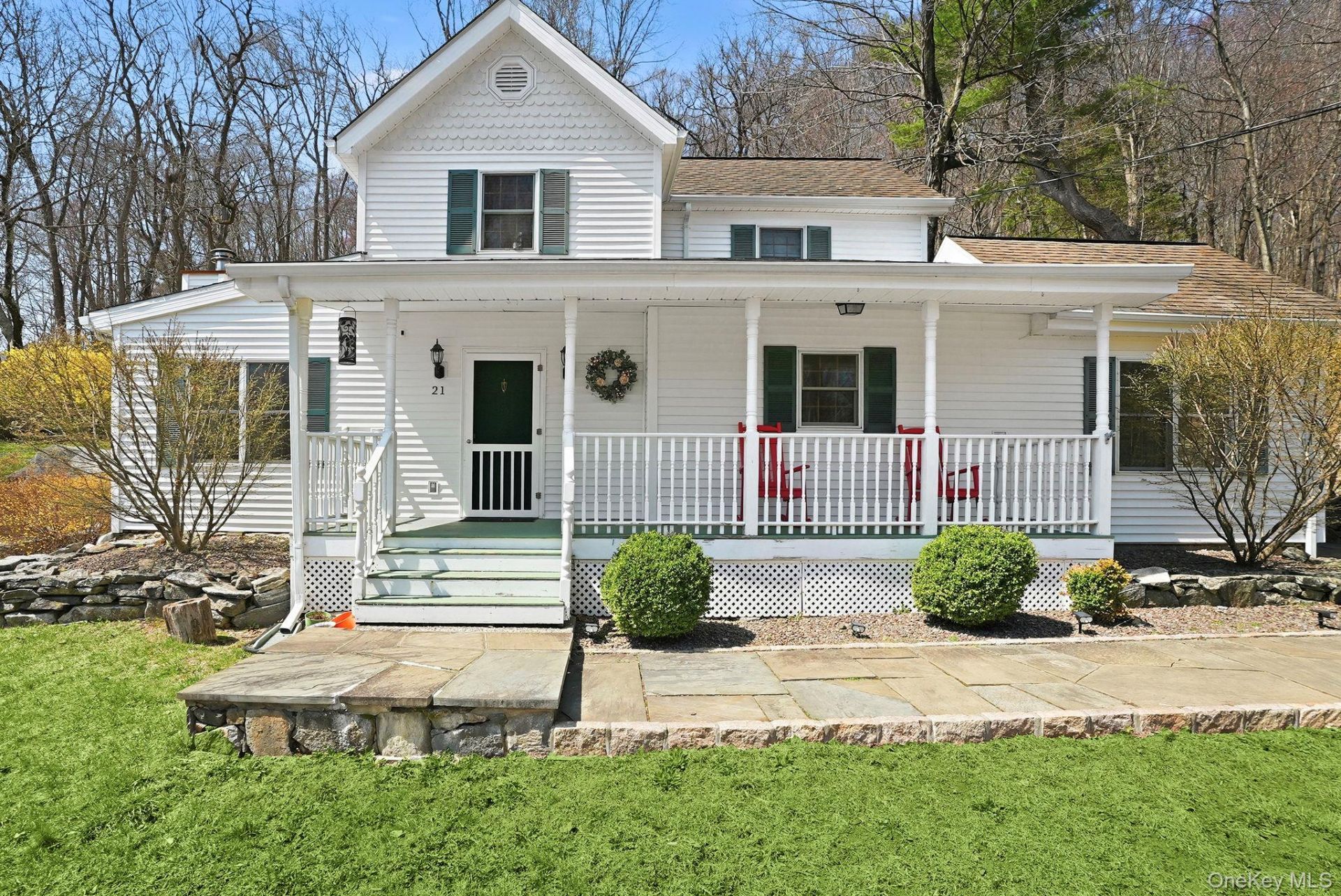 Circa 1840 Colonial set on 2.04 private acres in Putnam Valley, offers an idyllic setting with a layout that reflects thoughtful additions over time. The charming facade features a fish scale clad dormer and covered front porch that welcomes you to an open foyer with easy flow to the living and dining areas. The spacious living room features a vaulted ceiling, skylights and a wood burning fireplace, creating a bright, open and cozy feel with two distinct seating sections. The dining area with sliders to a stone patio opens to the updated kitchen that features granite countertops, stainless steel appliances, peninsula seating, and a new wine/beverage fridge. The kitchen is a perfectly positioned bridge to the flexible and bright family room/den/office with high ceilings and skylights. A full bath with laundry completes the main level. Upstairs, the primary suite offers vaulted ceilings, skylights, cove lighting, and access to an expansive, tiered deck and wisteria arbor with glorious views of the property. The lovely primary bath includes radiant heated tile floors and a tub/spa shower combination. Two additional well-proportioned bedrooms provide flexibility, including one with a large en-suite bath with tub/shower combination. Linen closet in the hall. The detached two-car garage with storage shed and finished upper-level storage space with hexagonal windows adds to the feeling of country charm. Large driveway provides ample parking and additional access to the yard. School bus pick up to elementary, middle and high schools is right by the driveway. All this with quick access to the Taconic, easy drive to Peekskill train station, hiking trails, shops and more. This delightful home will fly!